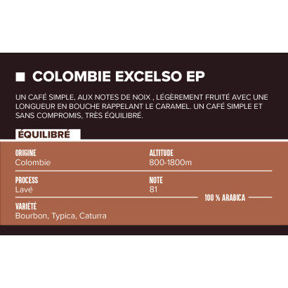Un café 100% arabica venu des hauteurs colombiennes, à la tasse douce, équilibrée et aromatique. Le profil typique du Excelso IGP, mis en valeur par une torréfaction adaptée aux méthodes douces ou espresso.