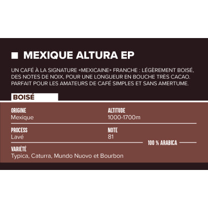 Ce café Altura du Mexique est un arabica entièrement lavé, aux notes boisées et chocolatées, parfait pour une tasse équilibrée. Issu de plusieurs micro-régions tropicales, il exprime une légère acidité et des arômes délicats. Disponible en torréfaction filtre ou espresso Omniroast.